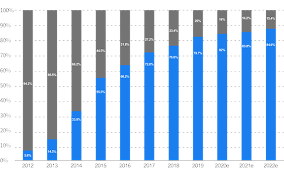 2012-2022中国网购交易额PC端和移动占比